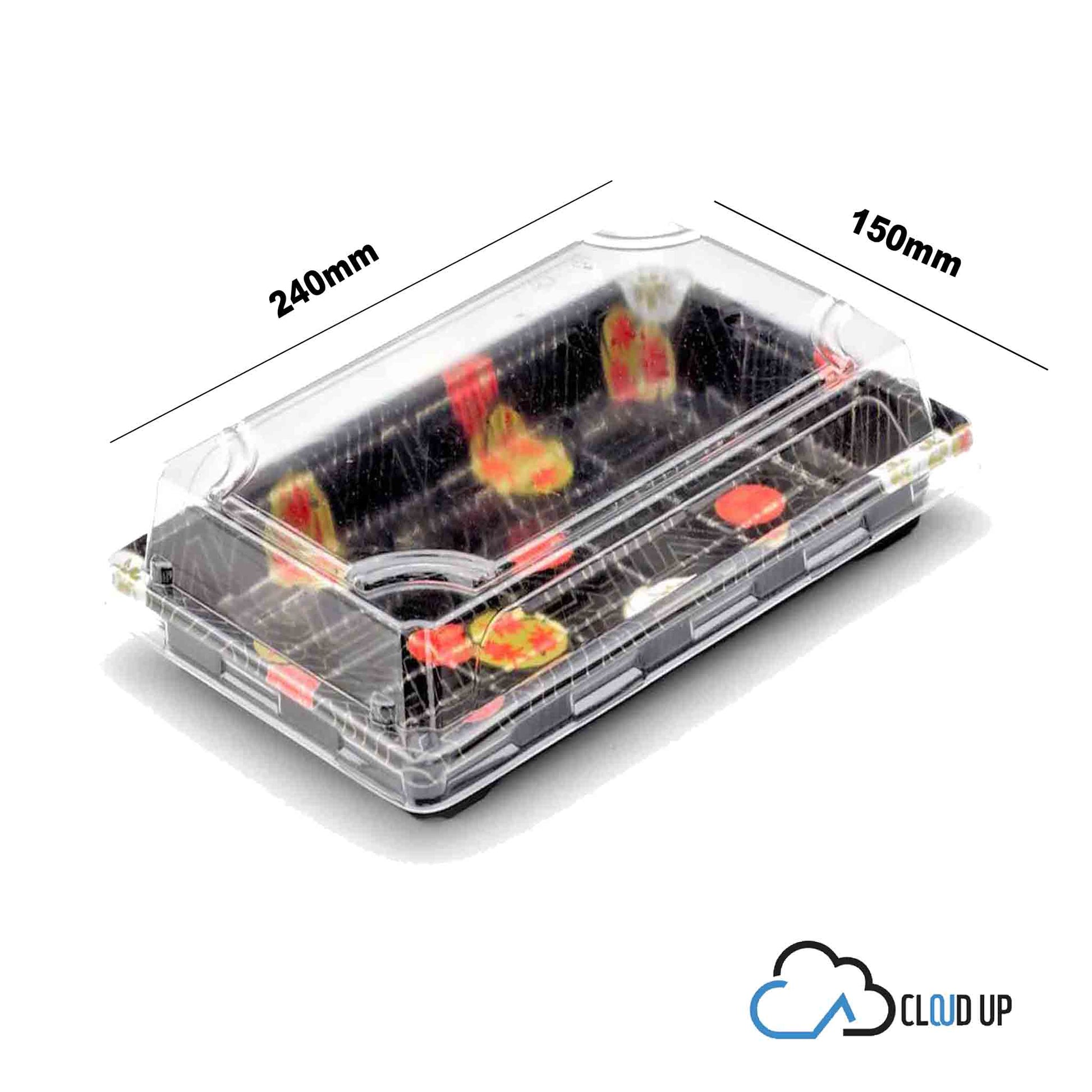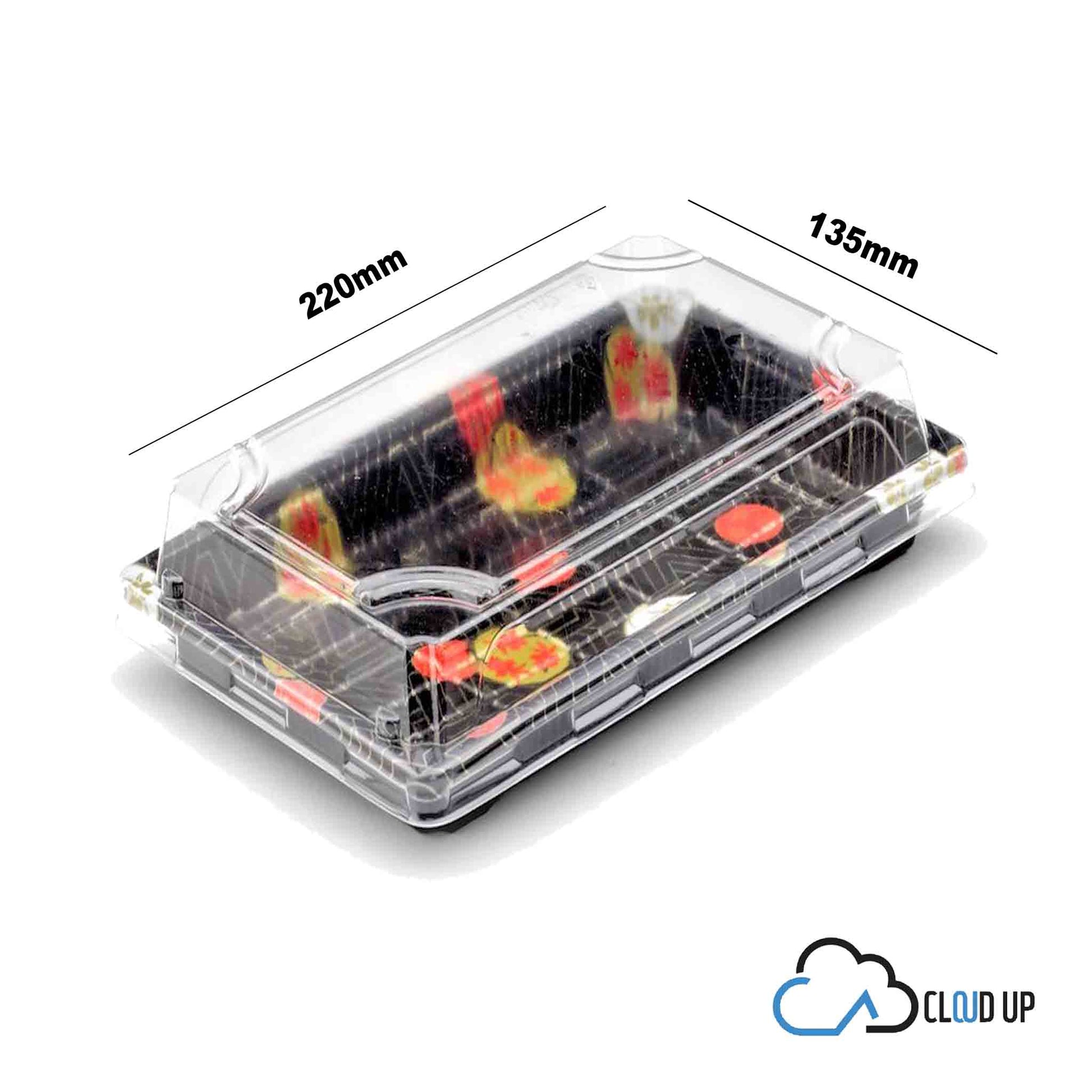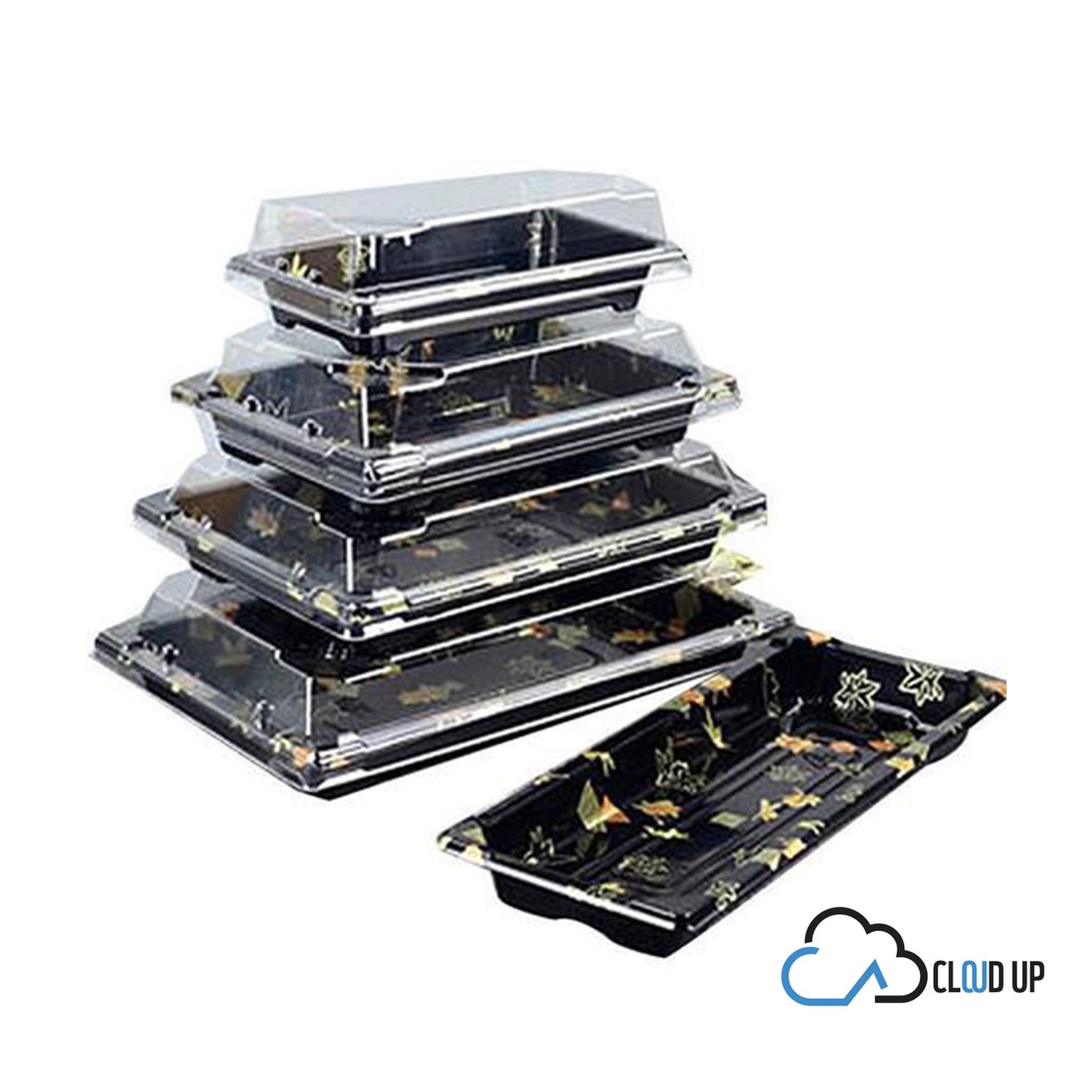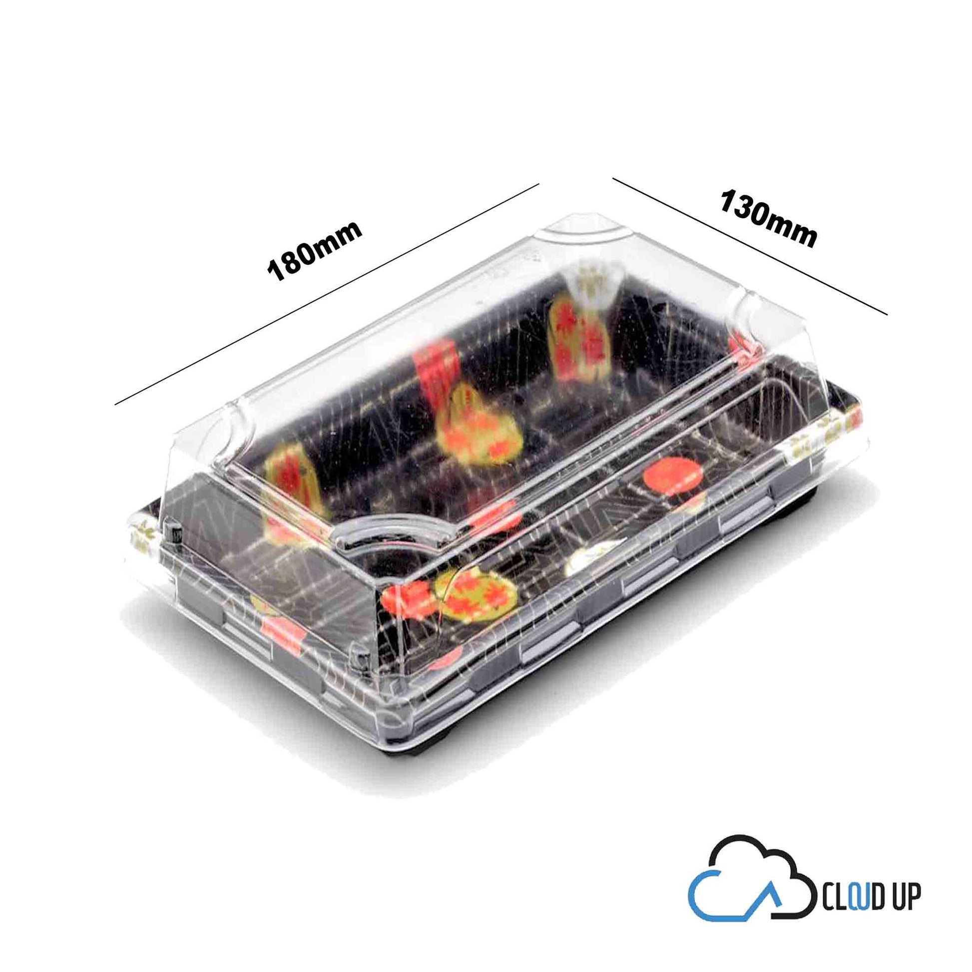 Vassoio sushi monouso con coperchio. Realizzato appositamente per contenere e trasportare in modo sicuro ed igienico i vostri piatti.