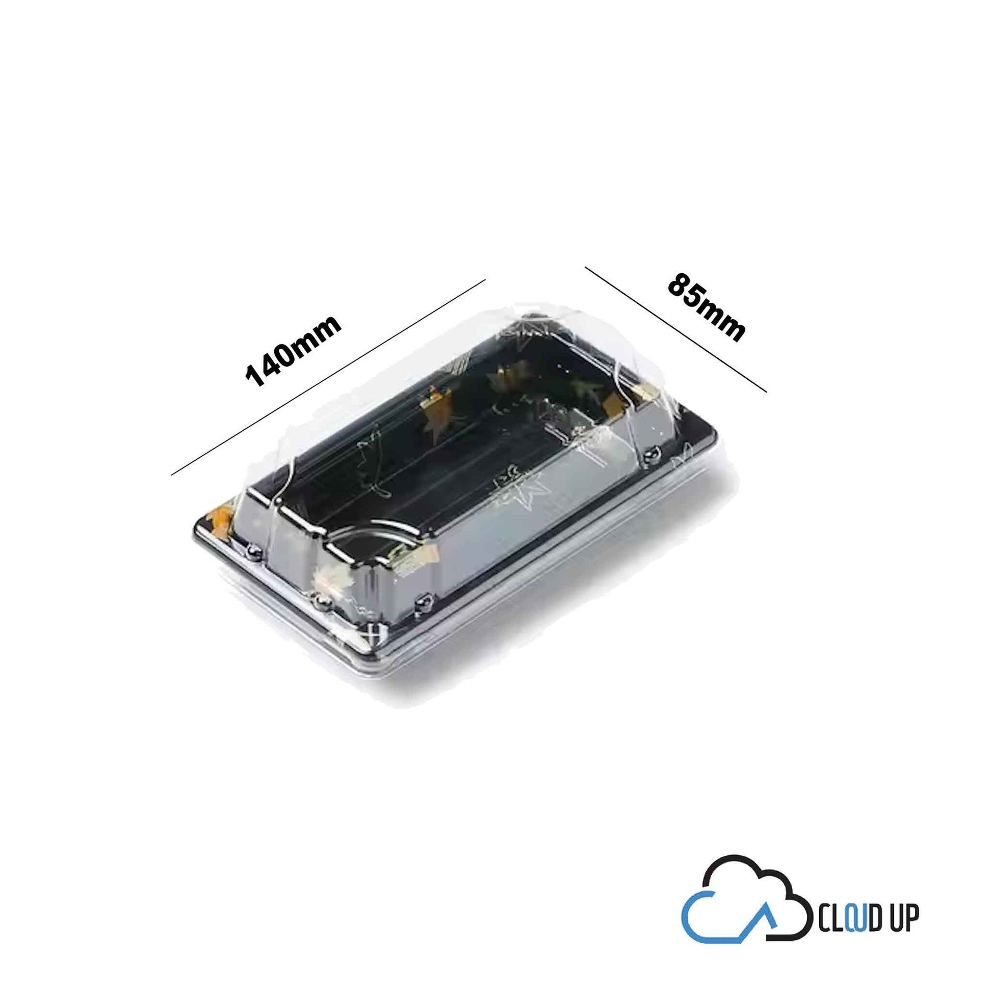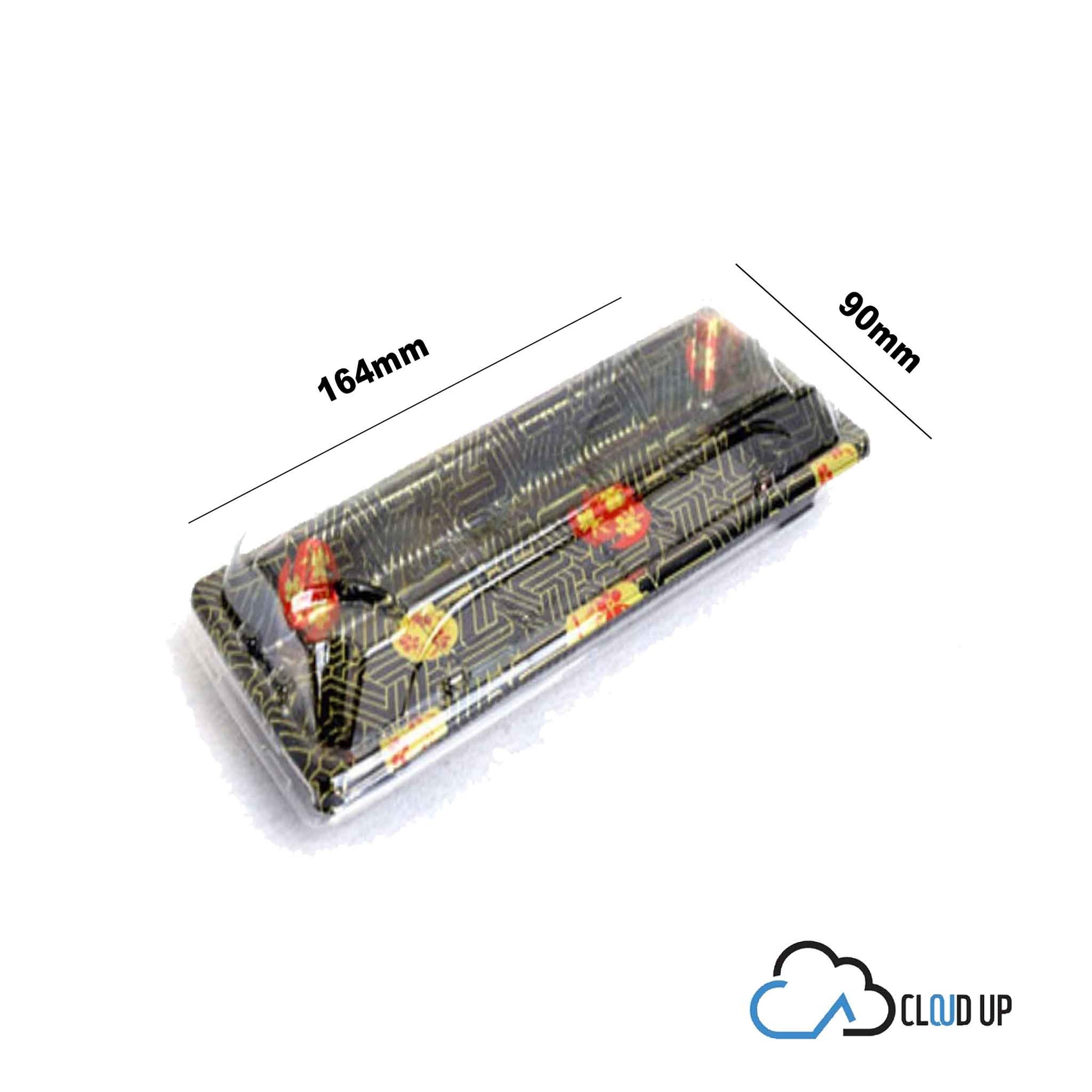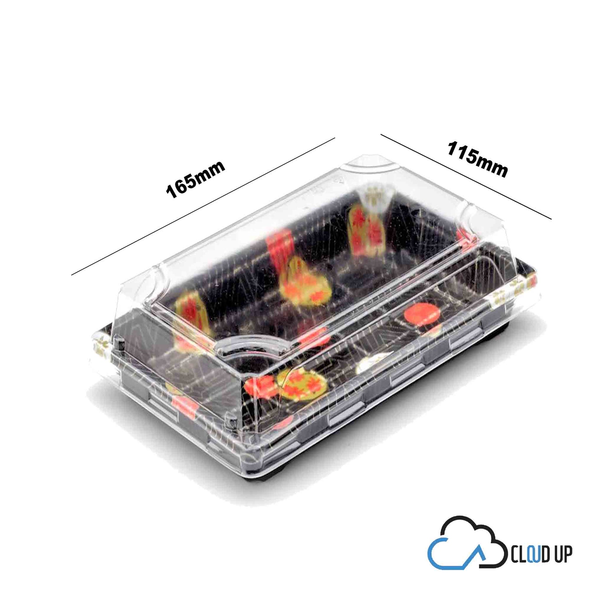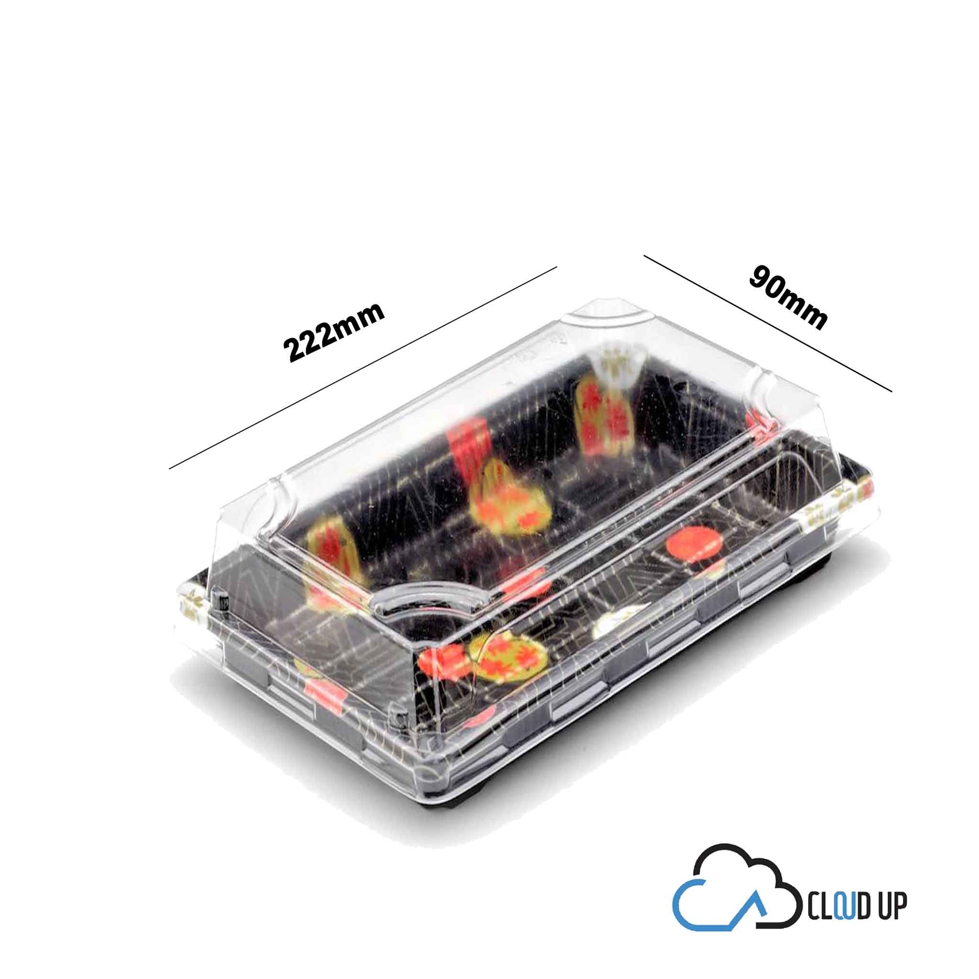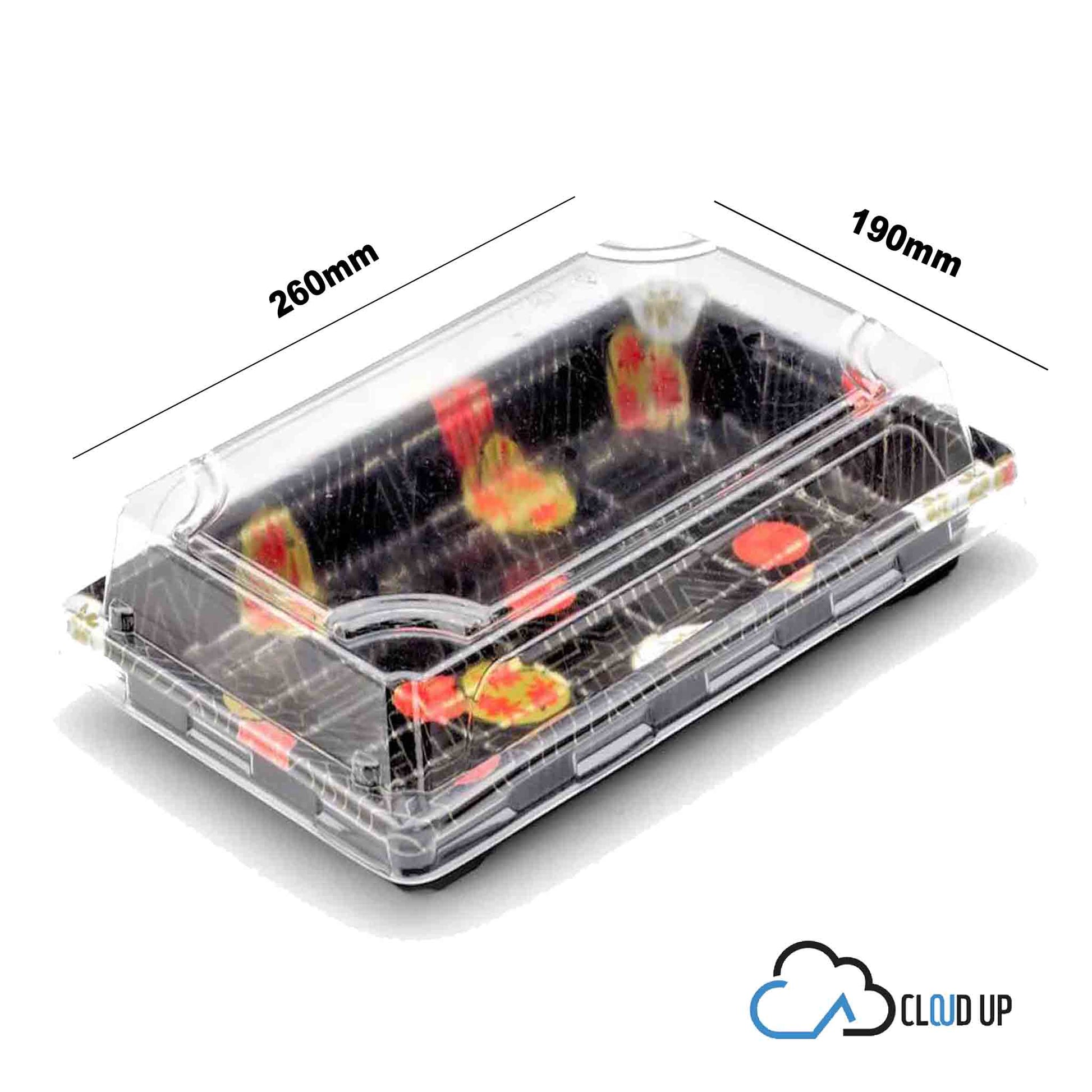 Vassoio sushi monouso con coperchio. Realizzato appositamente per contenere e trasportare in modo sicuro ed igienico i vostri piatti.
